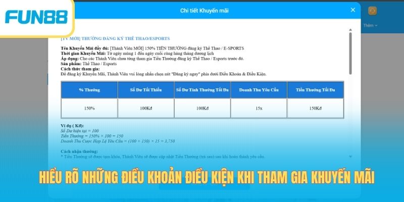 • Bước 1: Mỗi thành viên sau khi đăng ký có thể truy cập vào danh mục “khuyến mãi” trên trang chủ Fun88 và tìm kiếm khuyến mãi thể thao. Tìm đến sự kiện tặng 150% thưởng đăng kí thể thao/esports, đọc sơ qua về điều kiện, cách nhận ưu đãi, điều khoản điều kiện.